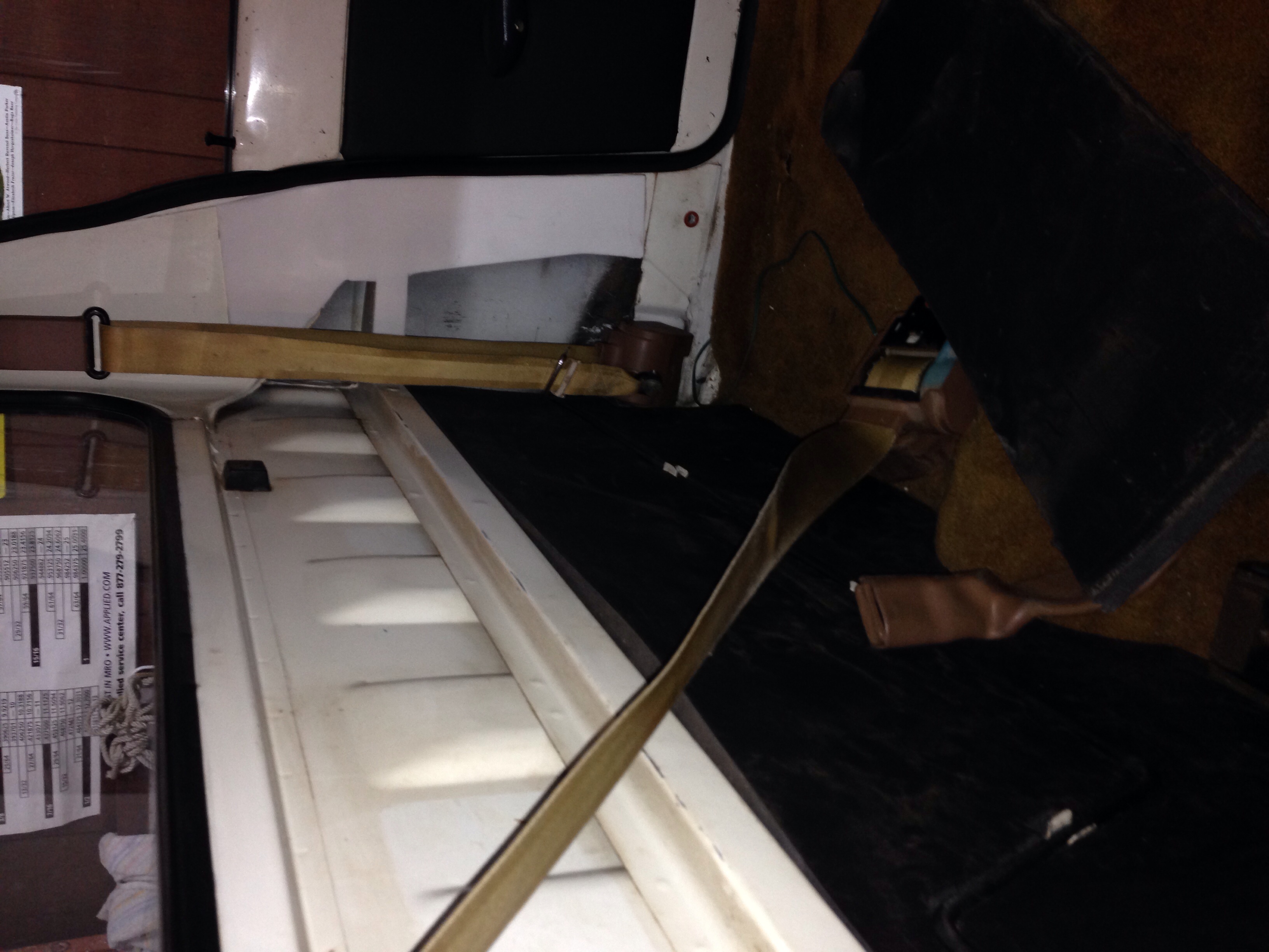 The door panels and headliner are black now. Tan carpet and seatbelts. The seats will be black eventually.