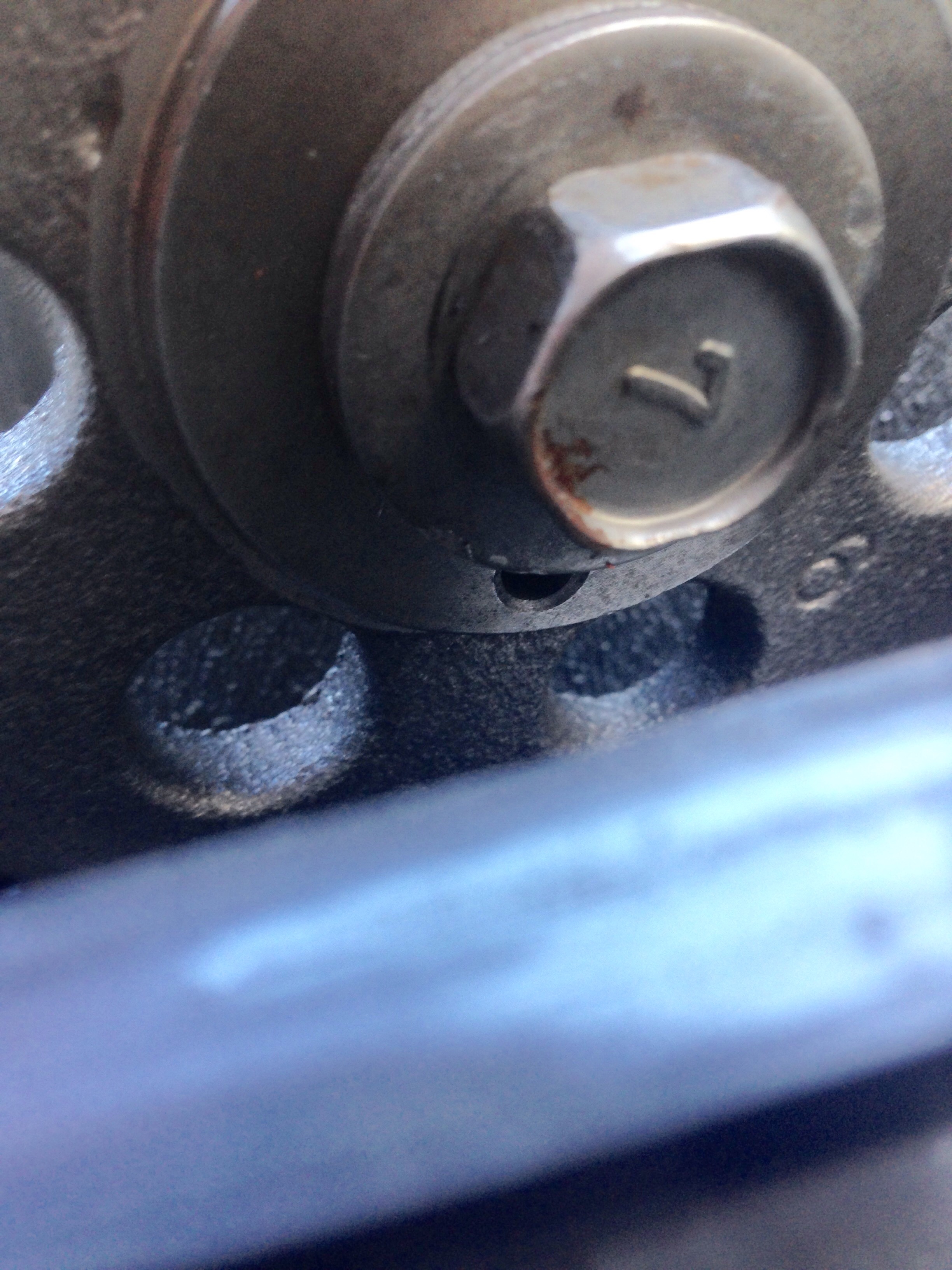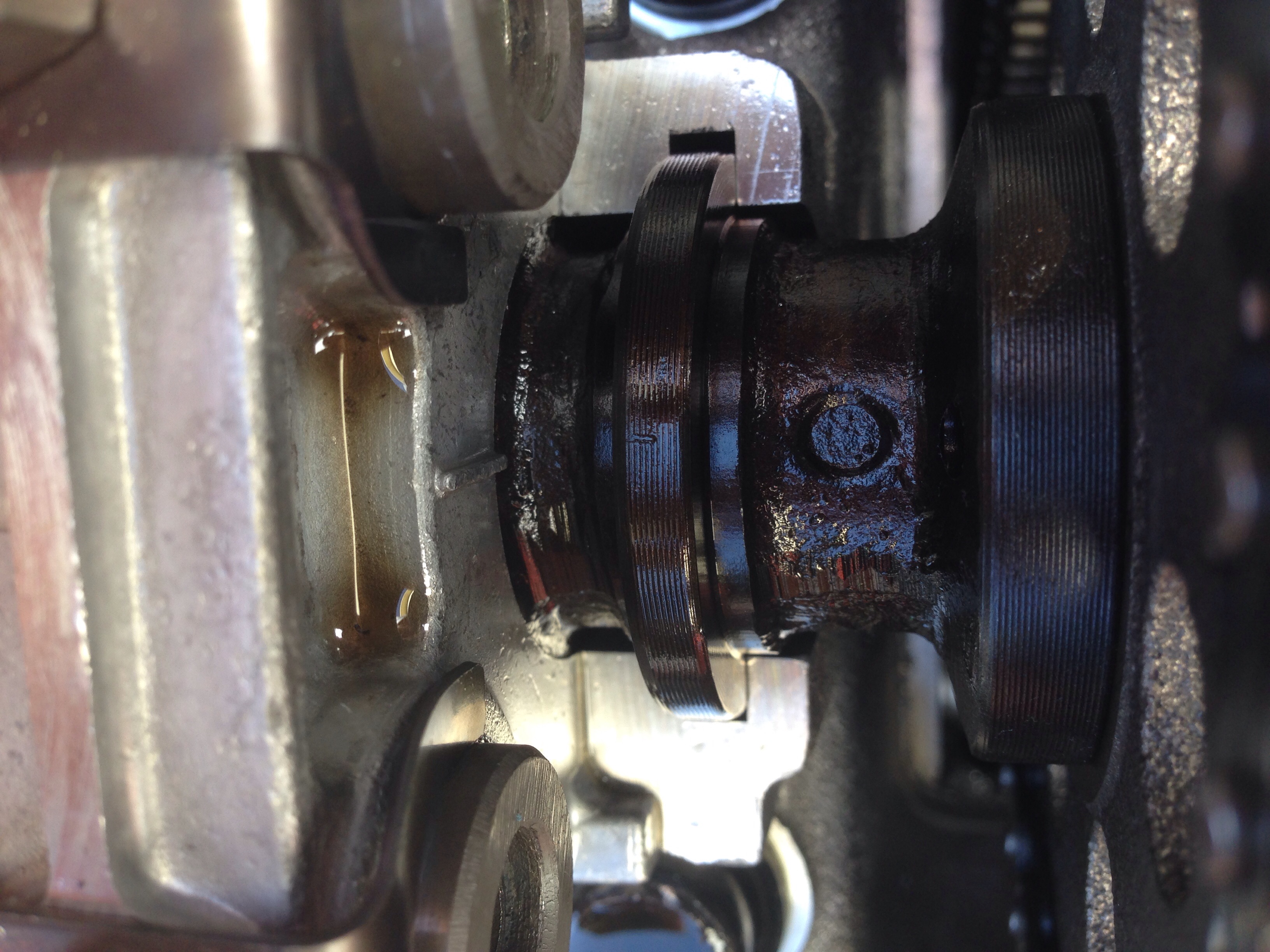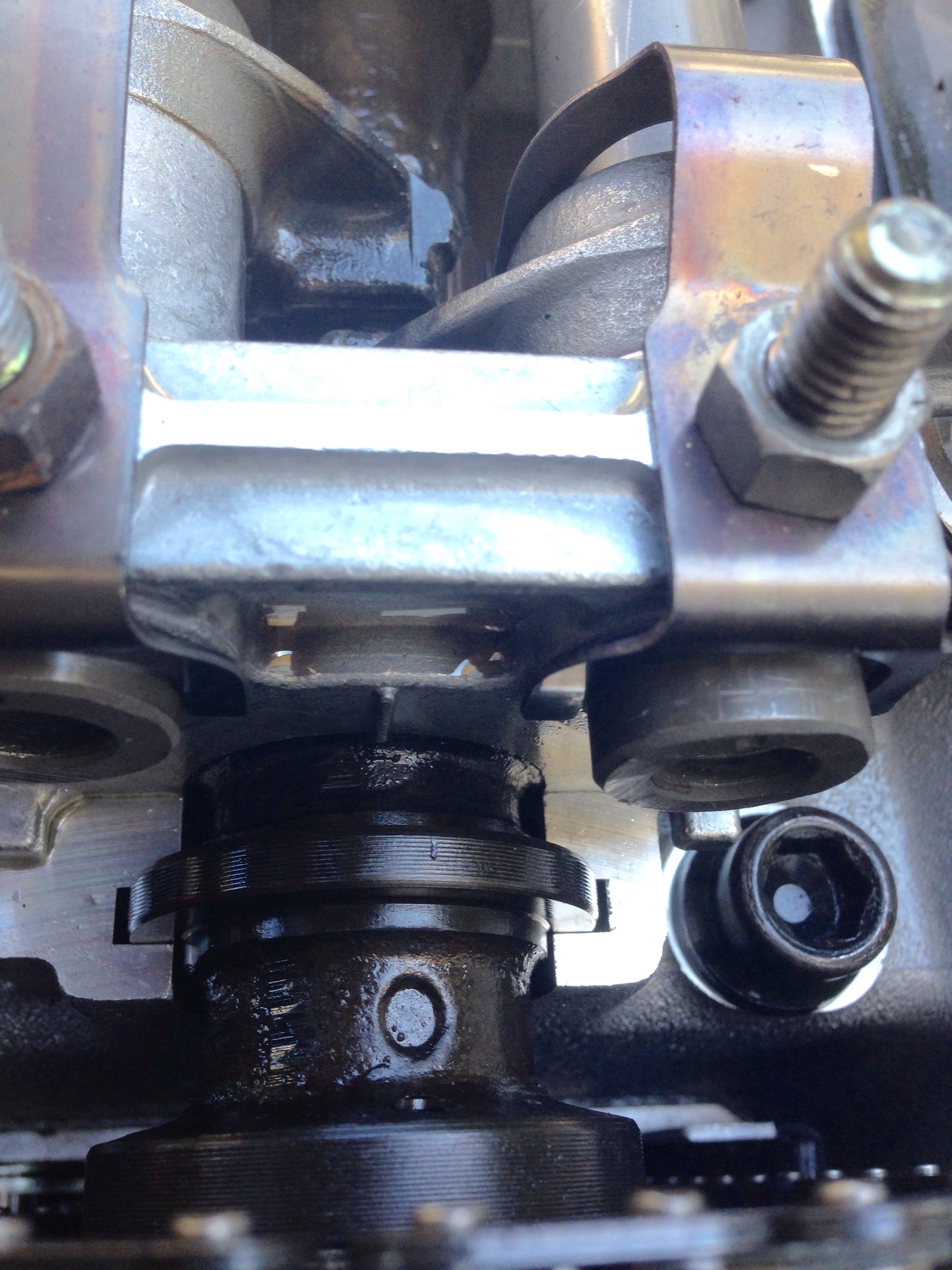 1st pic- Looks like the setting mark on the cam & front rocker bracket align, if so this puts the cam in position for #4 TDC on the compression stroke;