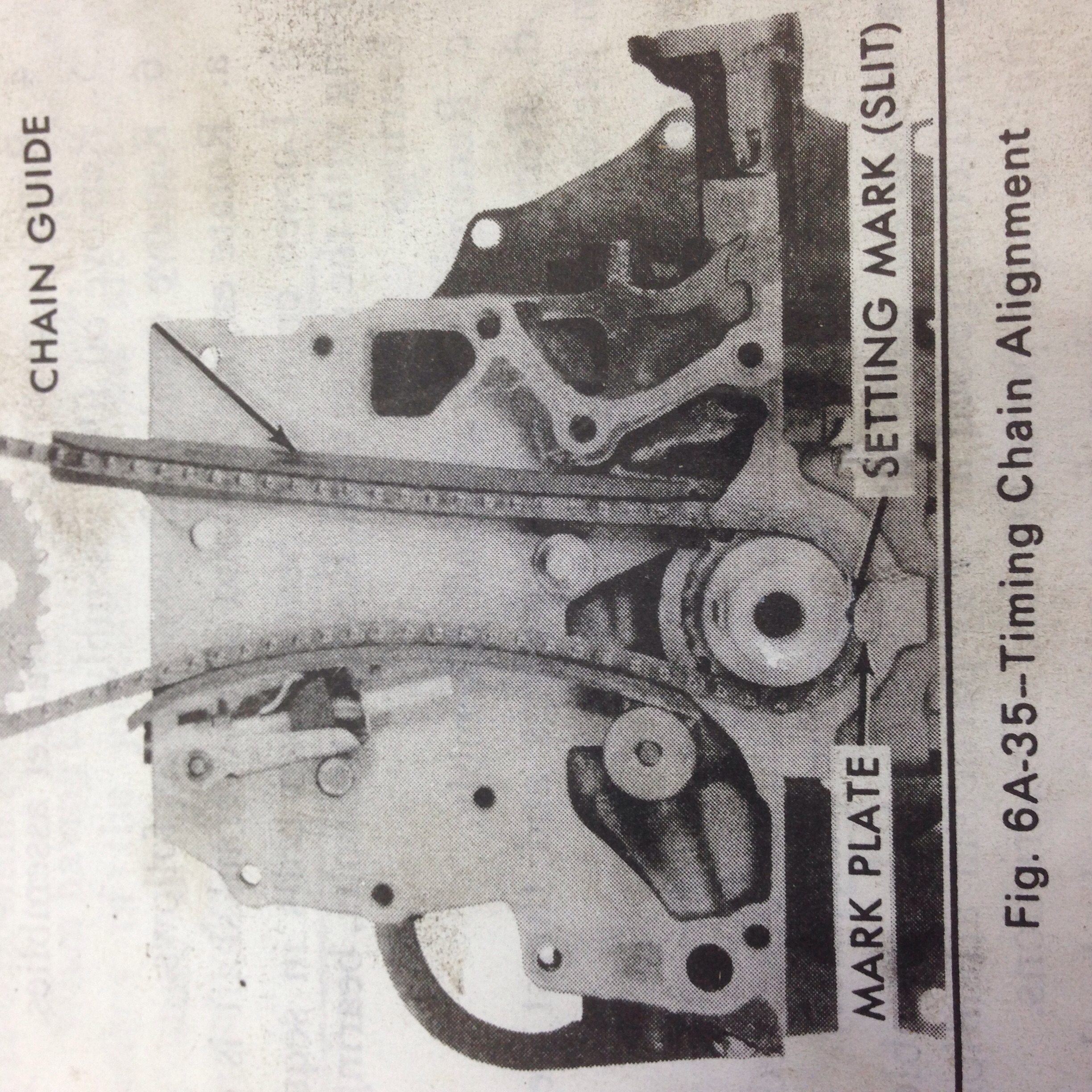 Looks correct. I never went by any slit, dot, or timing link. Basicly put the key way straight up and the pully should point to 0 degrees ignition timing. Then look behind the top timing chain sprocket and should line up with a "slit" or "v" at the top. If not, turn the crankshaft one more revolution to line it up on top correctly. At this point the distributor rotor should point to #4. If not, just change the spark plug wires in the cap instead of redoing everything. 1-3-4-2 counter clockwise.