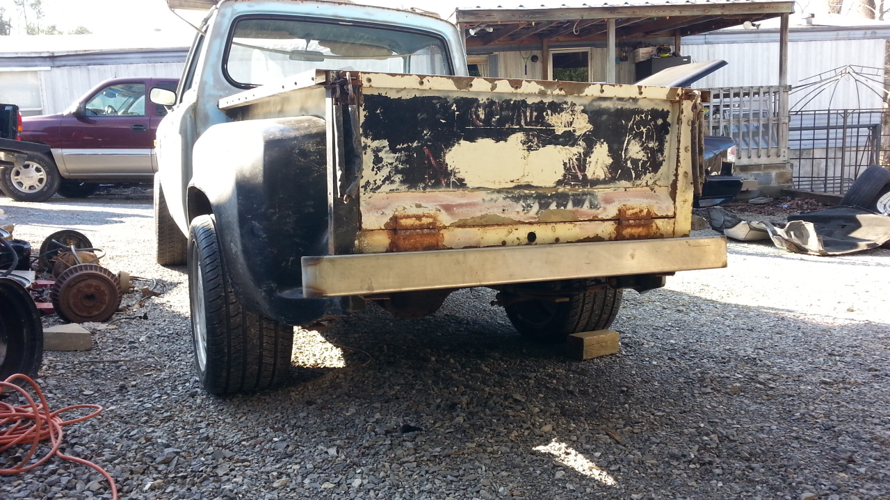 Getting closer. Need to raise the cab 3/4" because the bed is on the frame and will come up 1/4" when mounted. Check out my Stainless steel bumper. Been sitting here for years.