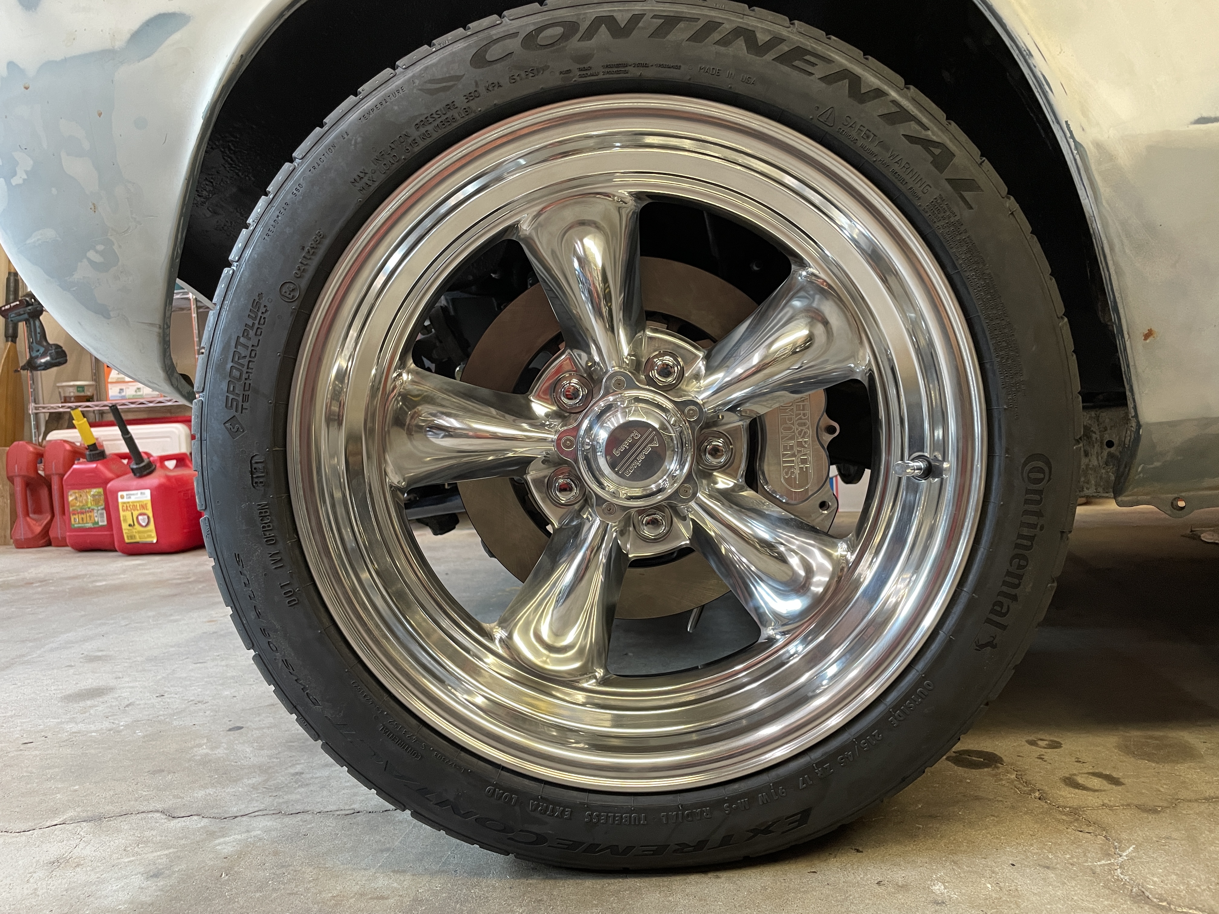 I went with the American Racing Torq-Thrust II wheels for the front on my Aerospace kit. They are aluminum, Polished, 17 x 7 in., 5 x 4.75 in. Bolt Circle, 4 in. Backspace. (Summit Part Number: ARE-VN5157761)