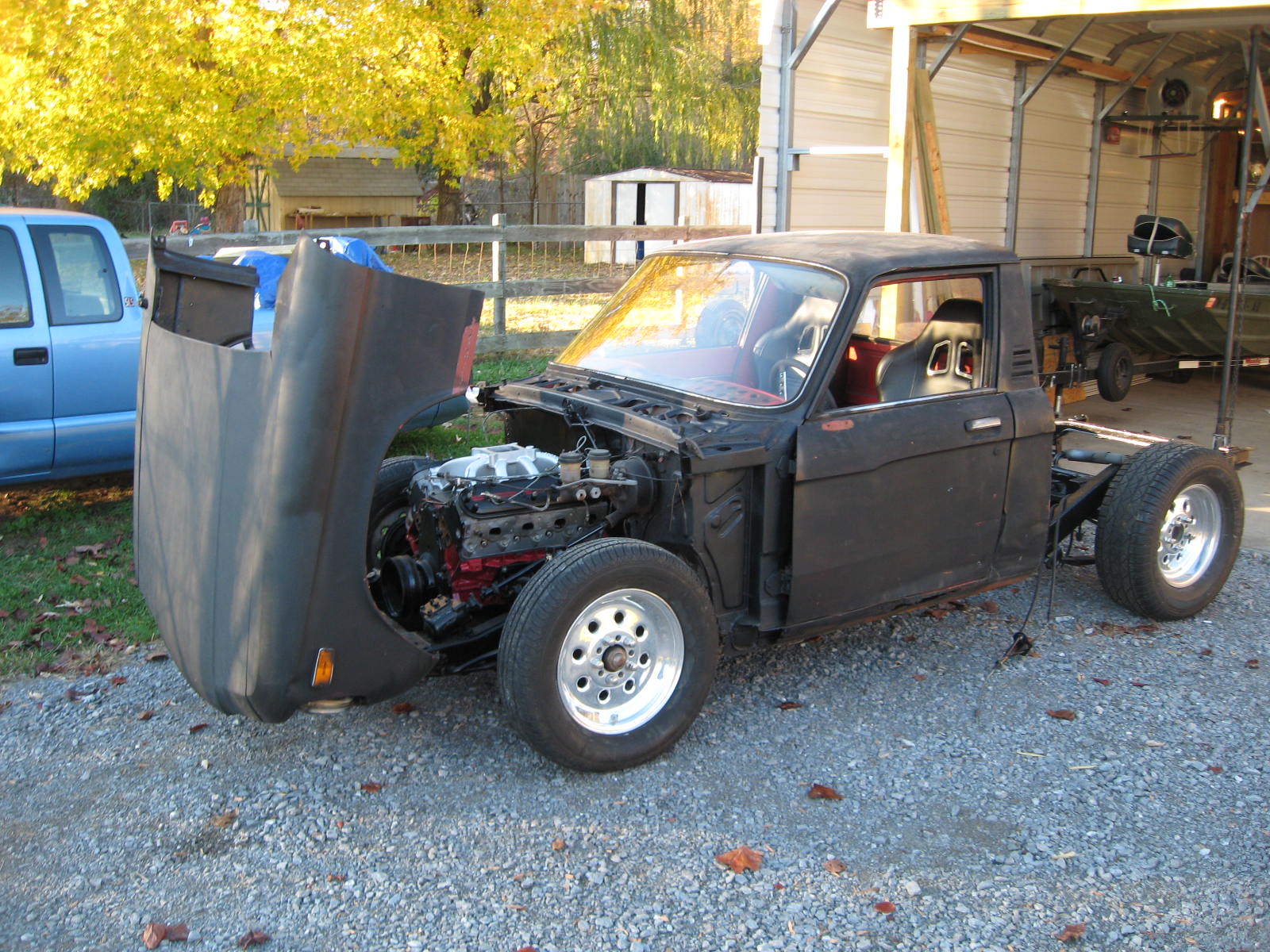 well for now it has a 231 buick v6 in it that has had plenty of go fast goodies put in it. dont know much about it cause thats the way i bought it. has an intermittent miss in it tho and i cant figure out what is causing it so out with the headache and in with a 327 and 700r as soon as they get here that is.