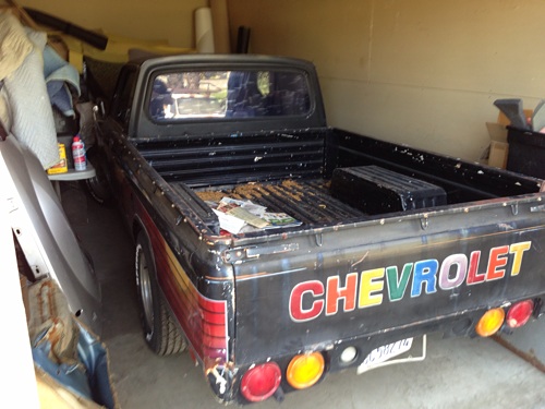 Well unfortunately I don't have access to a computer at the moment and my iPhone takes pictures that are too big for the forum to handle. I'll take lots of pics of the build then post them in the build up section when I get a new computer. All I can say is the paint is SEVENTIES! Black base with rainbow striping and the Chevrolet on the tailgate is all rainbowized with each letter being a different color.