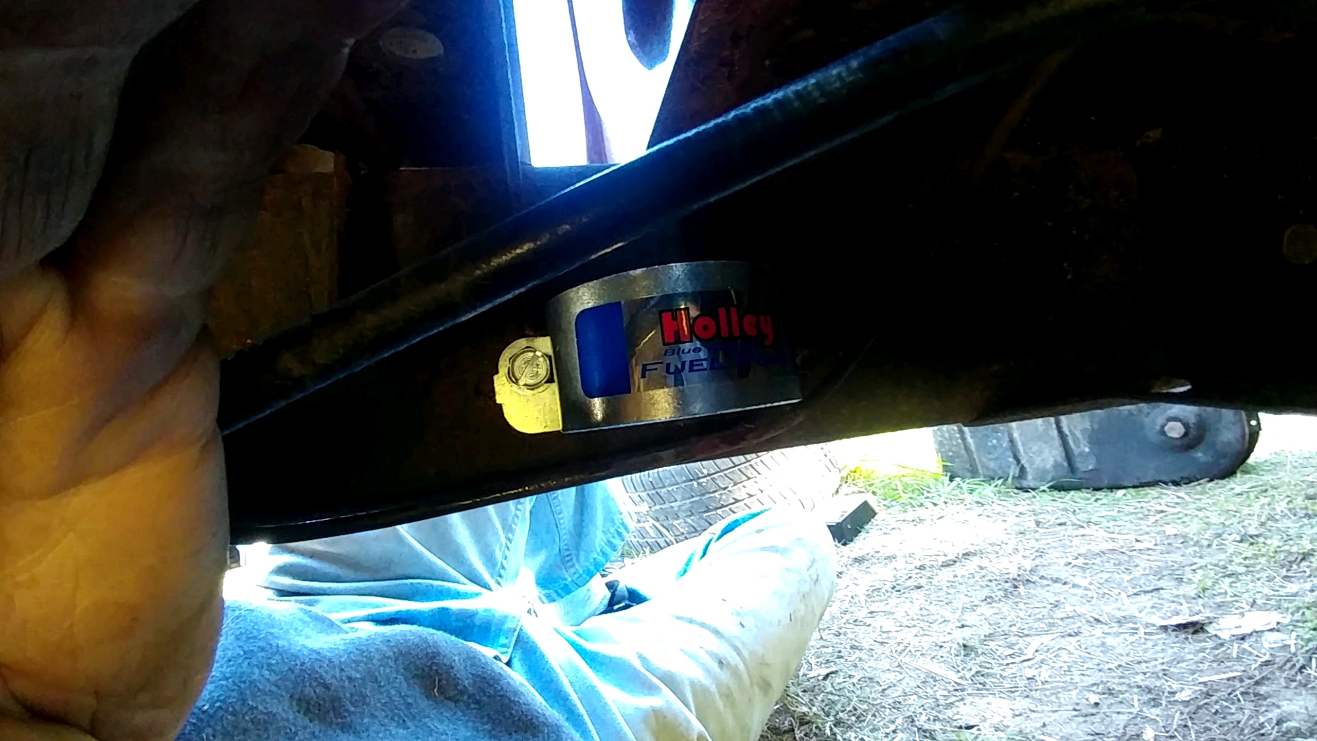 if you take the gas tank out, you get the room to drill the frame, tap the holes, and mount the plate for Holly red fuel pump on the 1972 Chevy luv