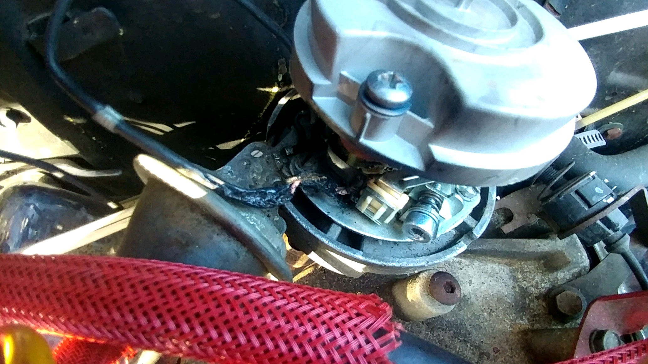 I am back to working on the miss fire again. I took the cap off the distributor, and found that the wire was melted, and causing a short before it got to the points. Here is a picture of the melted wire inside the distributor.