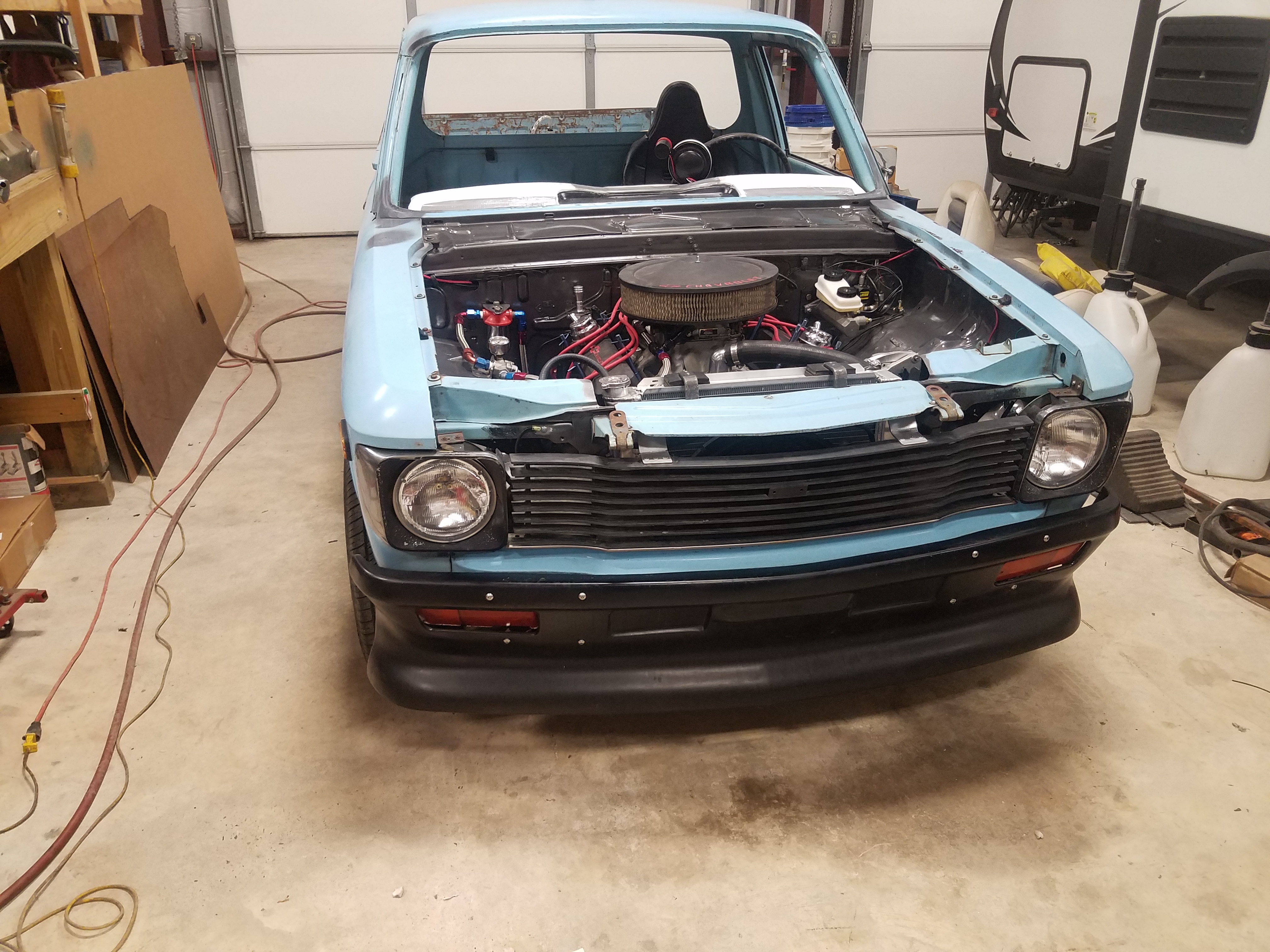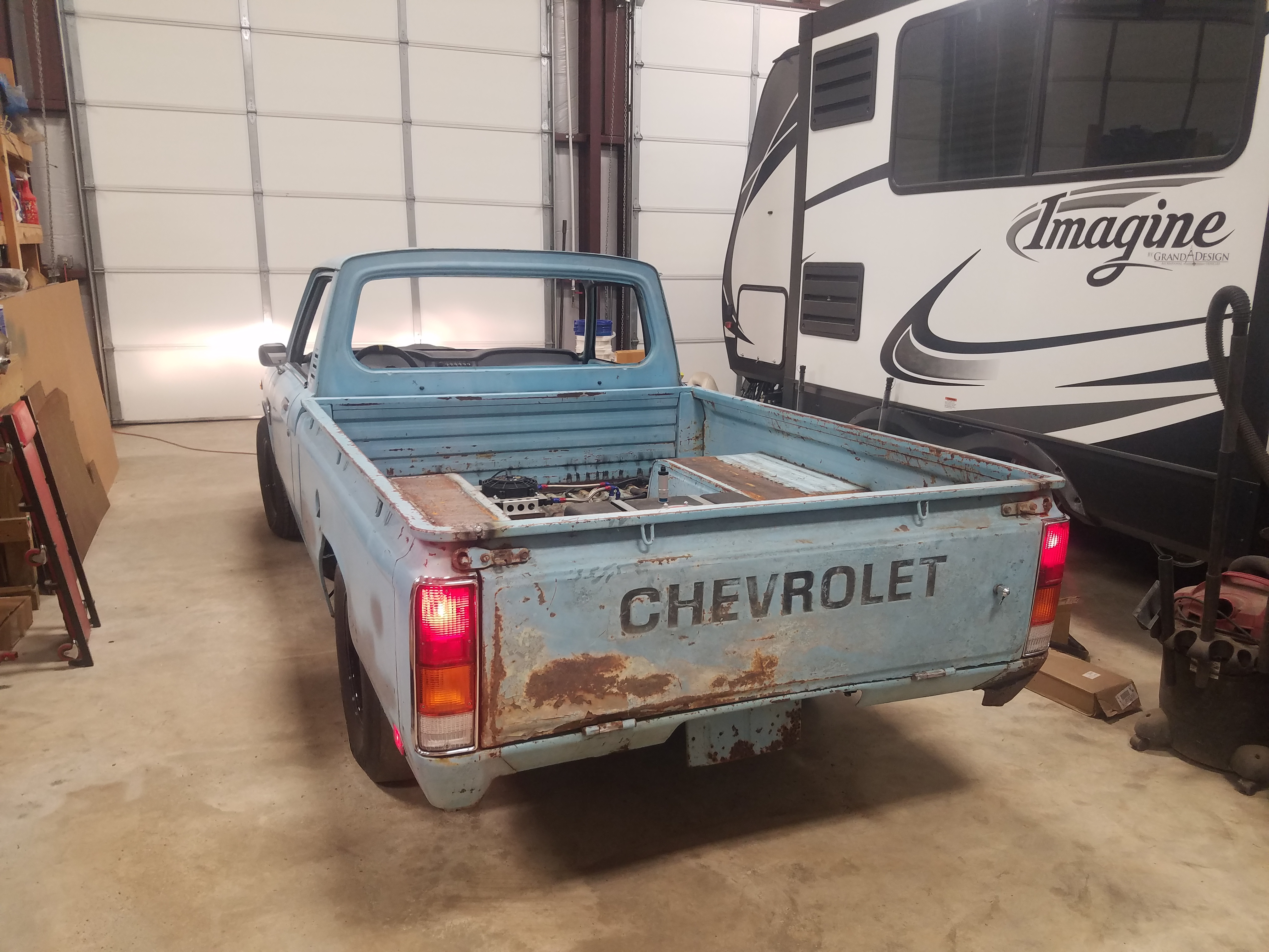 I have driven this truck twice. Just down the road and back Found a problem or two and corrected them. The biggest one involved firing order (as I didn't build this motor) it had a 4/7 swap cam. Swapped wires and BAM this thing will fly. Scrubbed it down to clean it up and got it ready to install the roll cage and glass then testing will begin!
