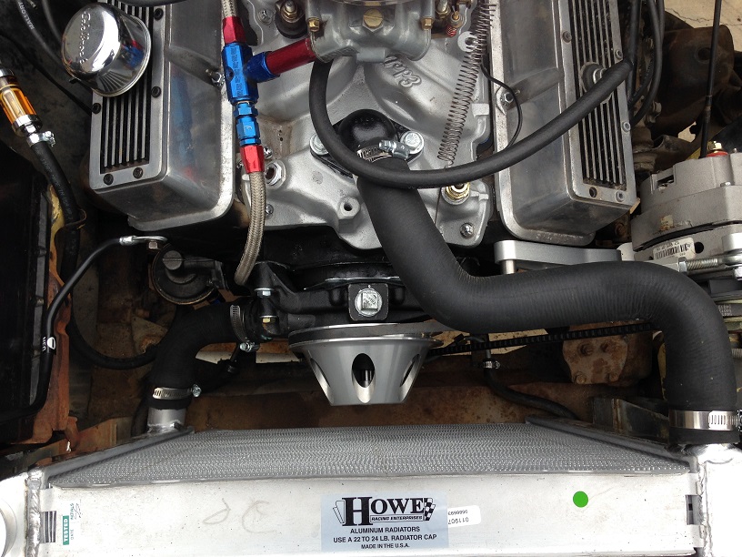 a small turbo on a 350 with 6 psi should be awesome..my 2.8 V6 ranger ran 6-7 psi of boost, didn't have forged pistons or an intercooler and lived a long life towing boats (small 19') and going to the Yuma area often in Summer in the mid 1990's. It did have 4.56 gears 31" tires and was a 4x4. The crew at Ak millers set up the carb and fuel pump. Here is a pic with the new aluminum goodies from Summit, line up perfectly, all for about $150.00 both pulleys and the trick alternator bracket.