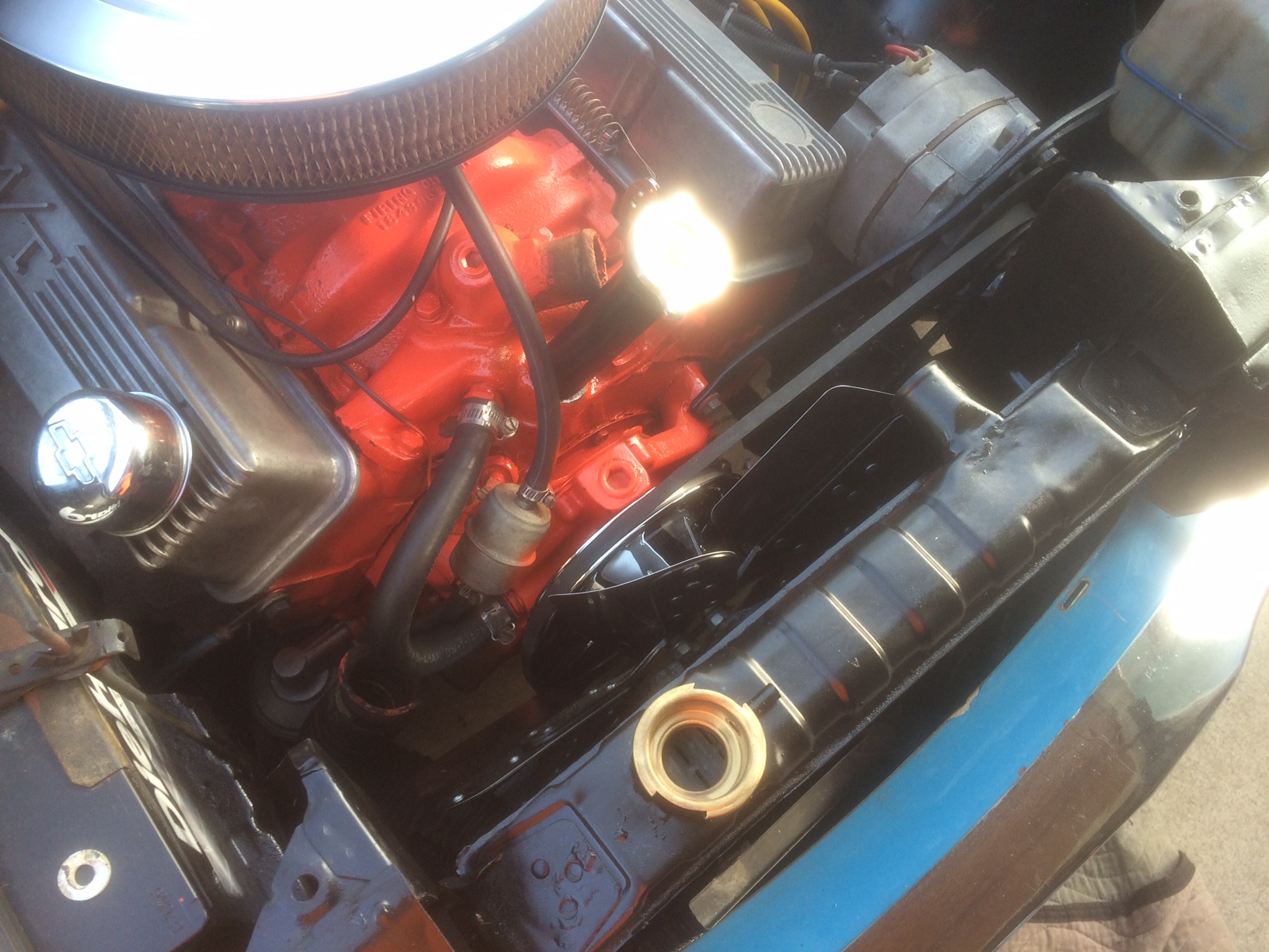 removed the TPI system for another project, using the 350 base motor with a 4bbl, alum intake and Pertronix ignition in a stock vacume advance dist. left over from my other car project.